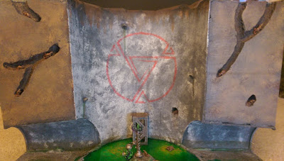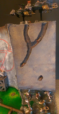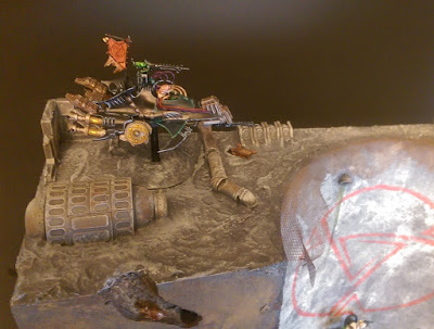 The big red Skrax symbol was done by making a stencil and sponging it on, to create that weathered look. A lot of the painting on this board was done using sponging. Dripping water and stains were done using GW washes.