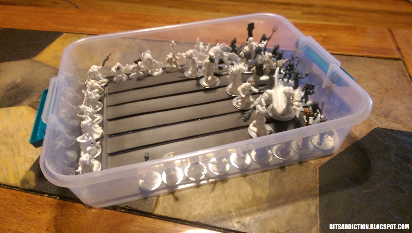 With metal washer bases and light plastic minis, they have a very good advantage with magnets and transportation. I found a cheap plastic container with lid at my Walmart. I wanted something about 3" deep, so it could hold my bigger bones minis.