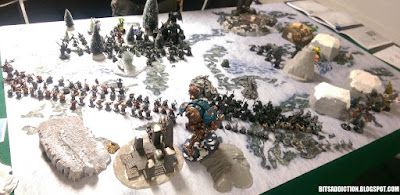 Da Big'un was caught off guard by the phosphorous traps as well, and turned out to be especially susceptible to them, losing a couple precious turns. Then destruction finally caught up with the Klad Barag and a few ironguts. They dealt mortal blows to the Klad Barag, and Drake knew it was going down. So in a final act before the boilers finally gave out, he lunged the massive machine forward to grappled Da Big'un and his mount, so when the machine shut down, at least there would be a crushing weight over top the menacing orruk monster.